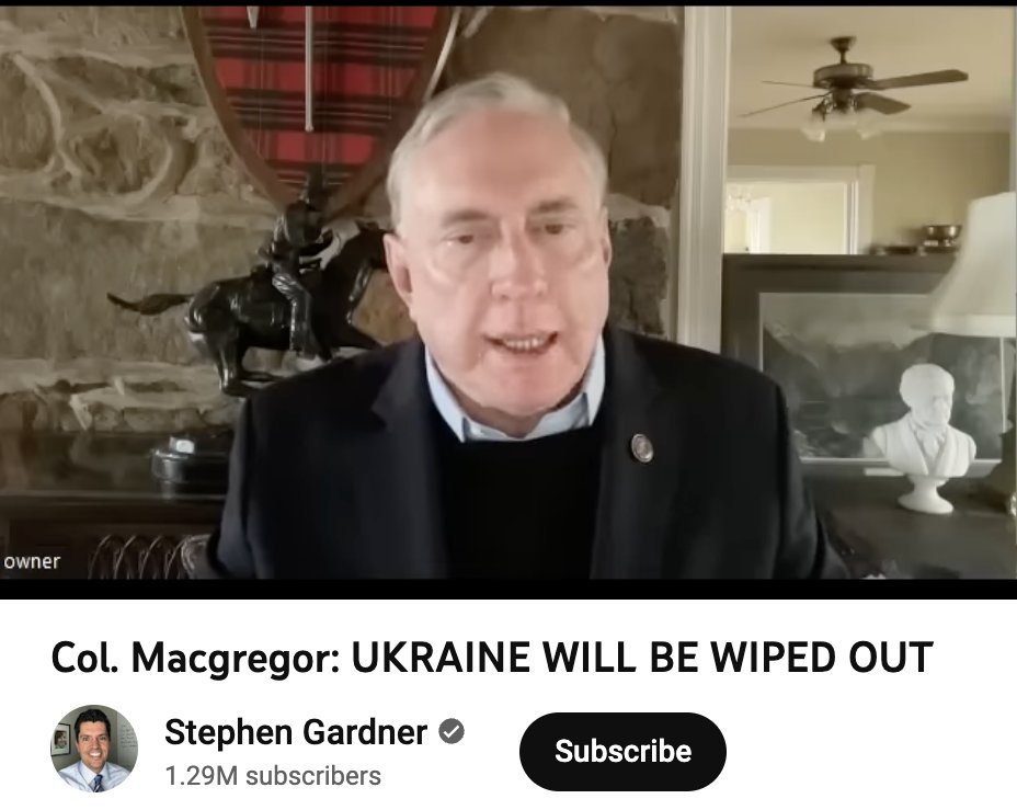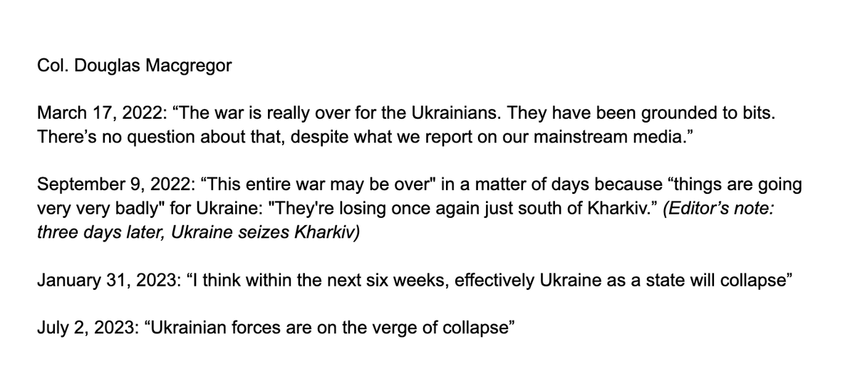 There's a bunch of "alt media" war pundits like Macgregor who've been spewing a nonstop geyser of bullshit for the past year and a half, but they inhabit media ecosystems with zero penalty for chronic, flagrant wrongness. No factual standards, no capacity for embarrassment