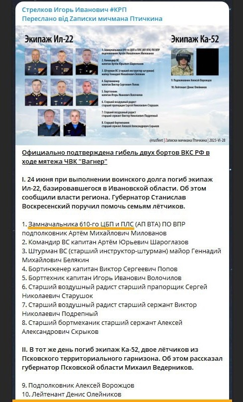 The deputy commander of the 610 Center for combat use and retraining of flight personnel was in the AN-22M intelligence plane Wagner shot down.