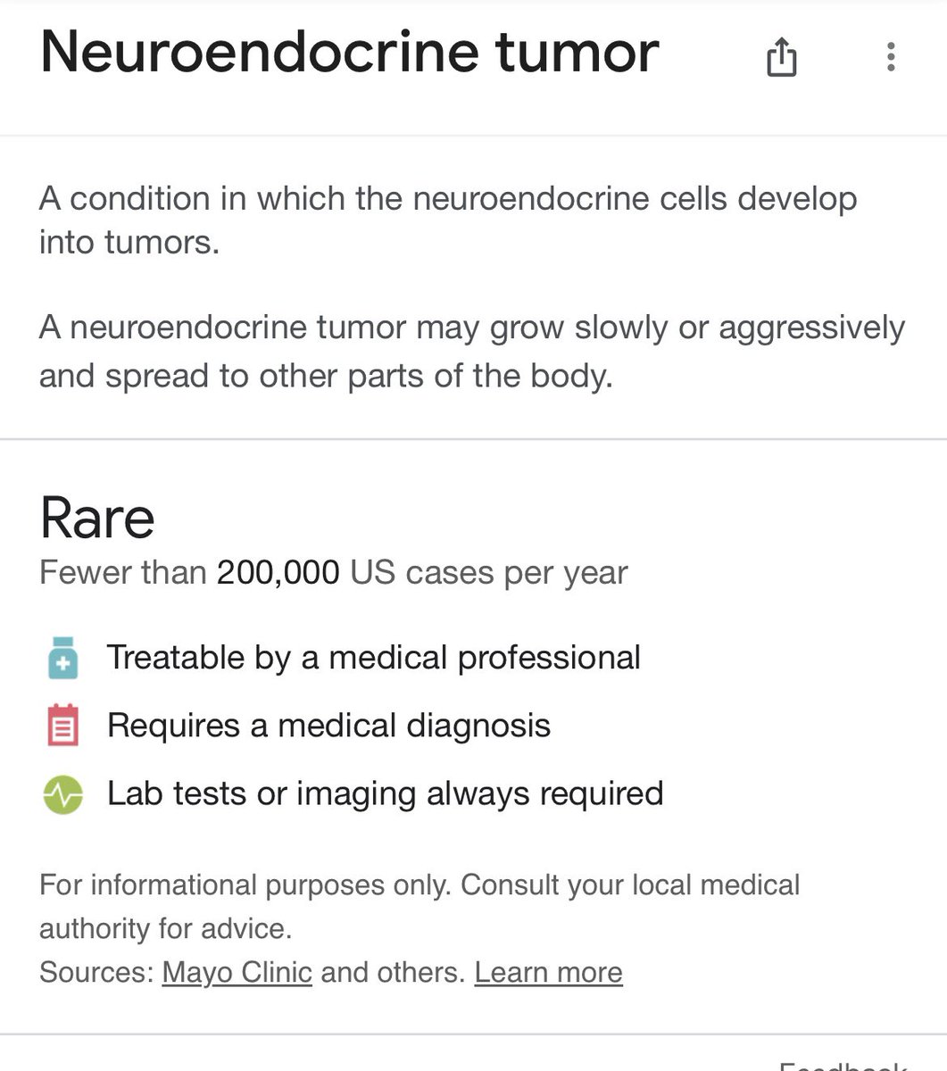 “My radiologist called me. He said he believes he sees two neuroendocrine tumors that have spread from your small intestine to your liver.