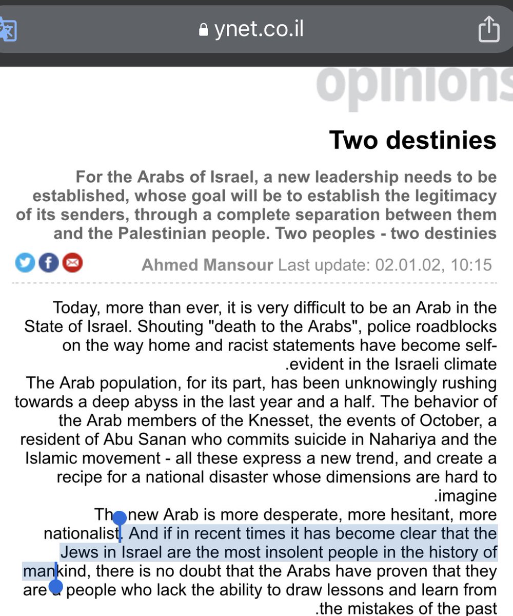 @RashadAlhindi @AhmadMansour__ @pagreenwood Mansour has now defamed me & Hyphen as Antisemites as an excusenfor not answering our requests for comment. The same guy who wrote in 2002 that “the Jews in Israel are the most insolent people in the history of mankind”.