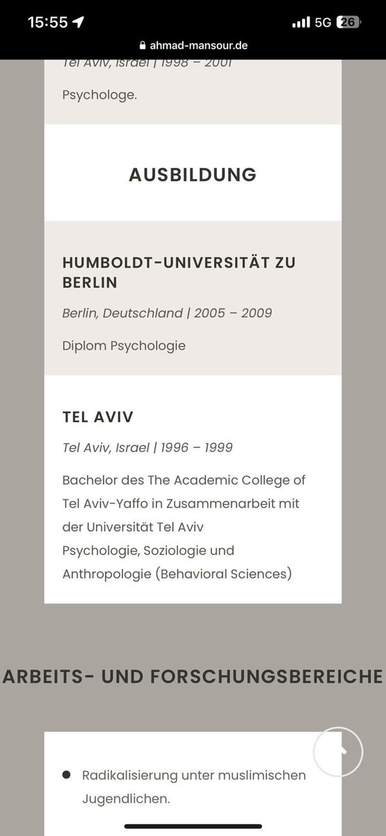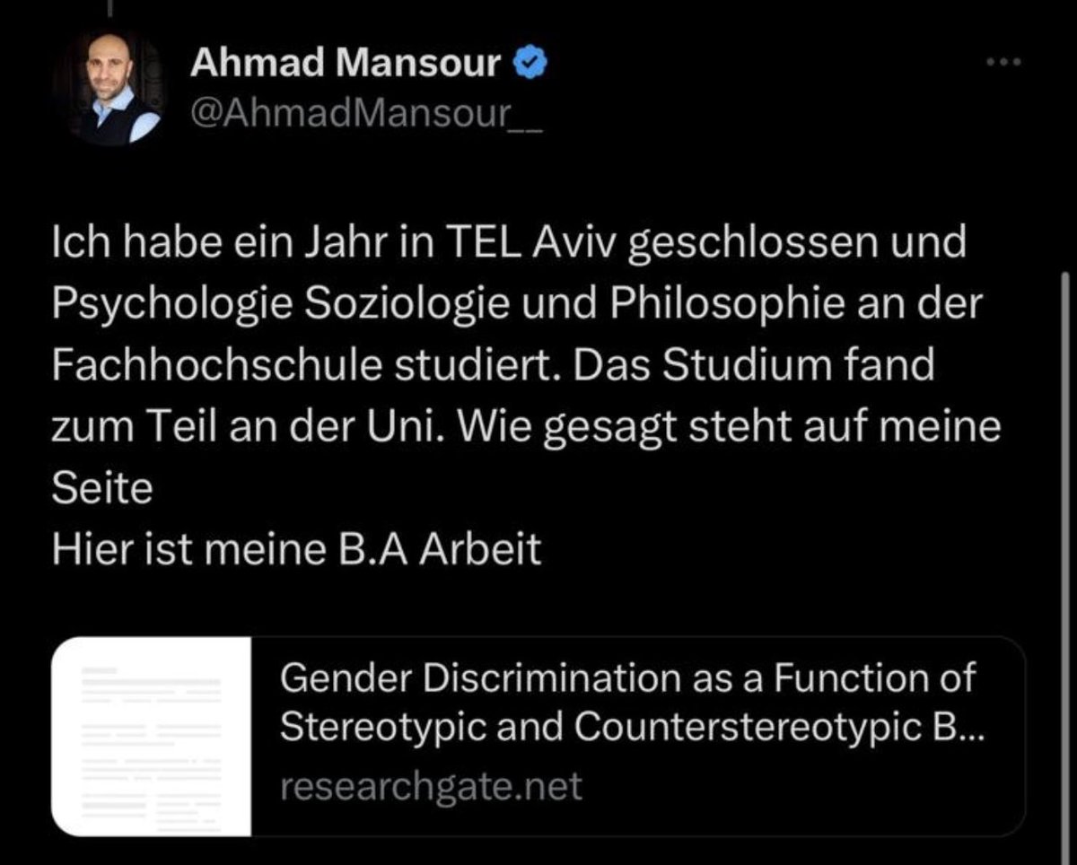 @RashadAlhindi Where/what did Mansour study? In German interviews and his books, he claims the prestigious uni of Tel Aviv. But contemporaries remember him studying at the Academic College of Tel Aviv Yaffo. The college confirmed to me that he graduated with a BA in Behavioural studies in 2000