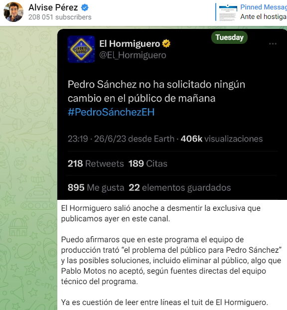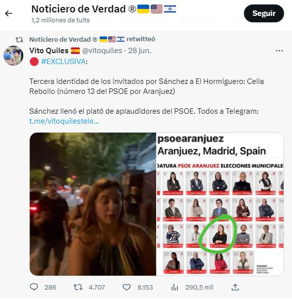 Antes del programa, tanto Vito Quiles como Alvise difundieron el bulo que desmintió inmediatamente el Programa de El Hormiguero. Ambos se anotaban la exclusiva de la mentira.