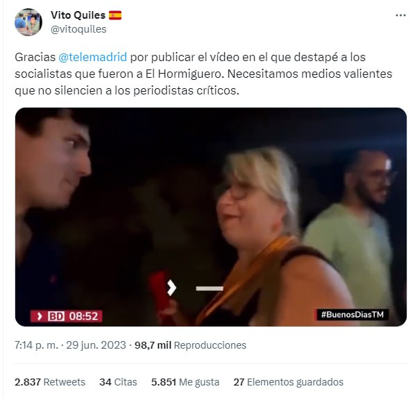 Aunque parezca increíble Telemadrid le dio cobertura a Vito Quiles y difundió el vídeo publicado.