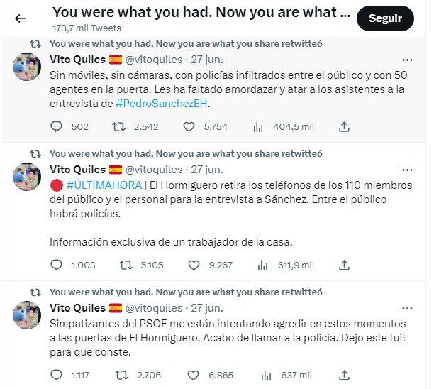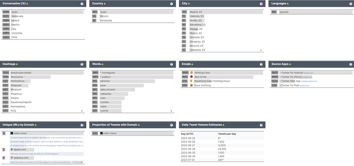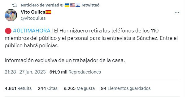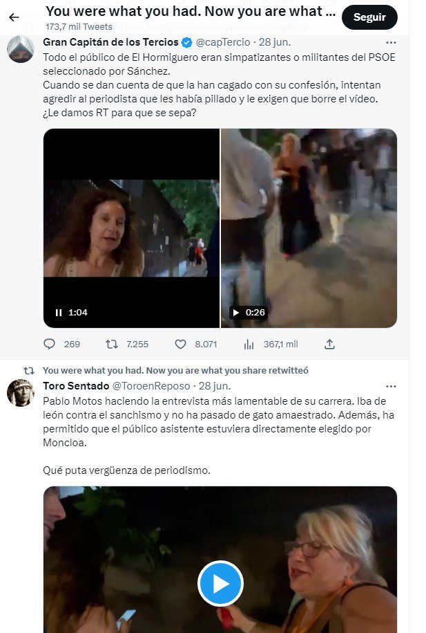 Esta sería el resumen de la conversación con el HT donde destacan los tuits de Vito Quiles difundiendo el bulo que todo el público fue elegido por Pedro Sánchez. Para ello grabó a la gente a la salida del programa y seleccionó a los simpatizantes del PSOE.