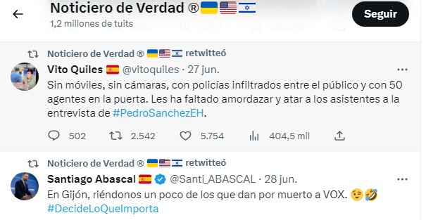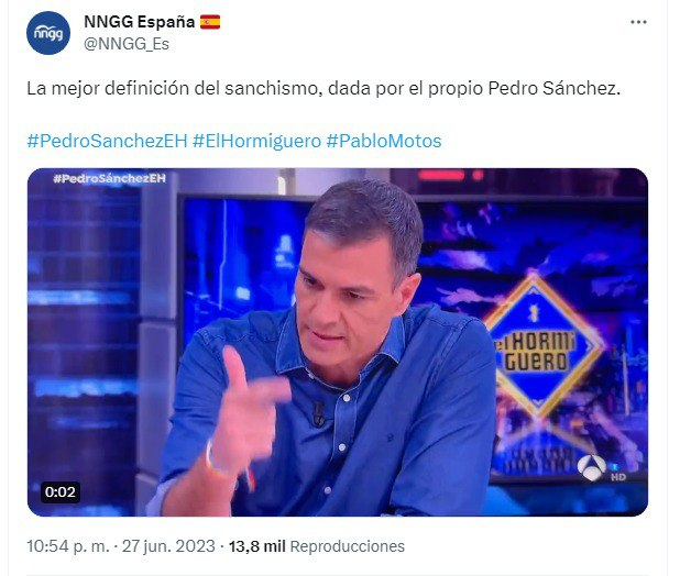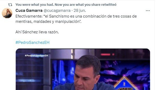 Las cuentas automatizadas anteriormente mencionadas además de retuitear masivamente el bulo del entorno de VOX y Vito Quiles, también retuitearon masivamente la estrategia del PP de cortar el fragmento de Pedro Sánchez sobre el Sanchismo que difundieron todos sus portavoces.