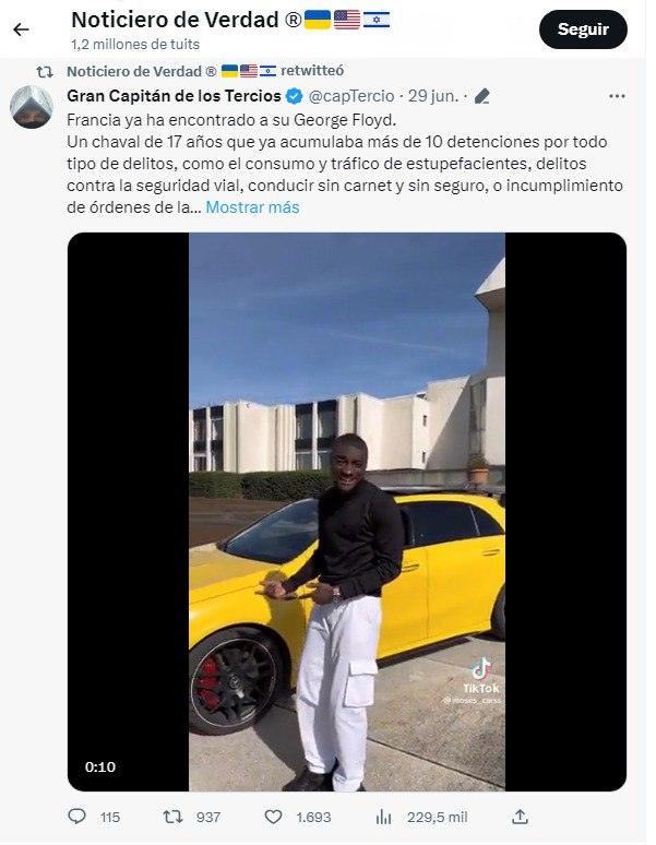 Para que vean como funcionan esta cuenta con decenas de miles de bots a su disposición para difundir bulos aprovechan cualquier situación para generar odio difundiendo bulos como hizo esta cuenta con los disturbios en Francia.