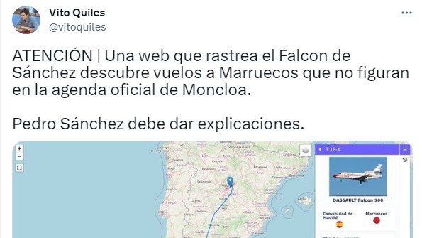 Vito Quiles publica un bulo sin una sola prueba. Dice que una web descubre vuelos del Falcon a Marruecos que no figuran en la agenda... para ello publica un viaje del 10 de octubre de 2022 donde Batet viajó a Rabat.