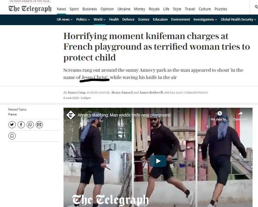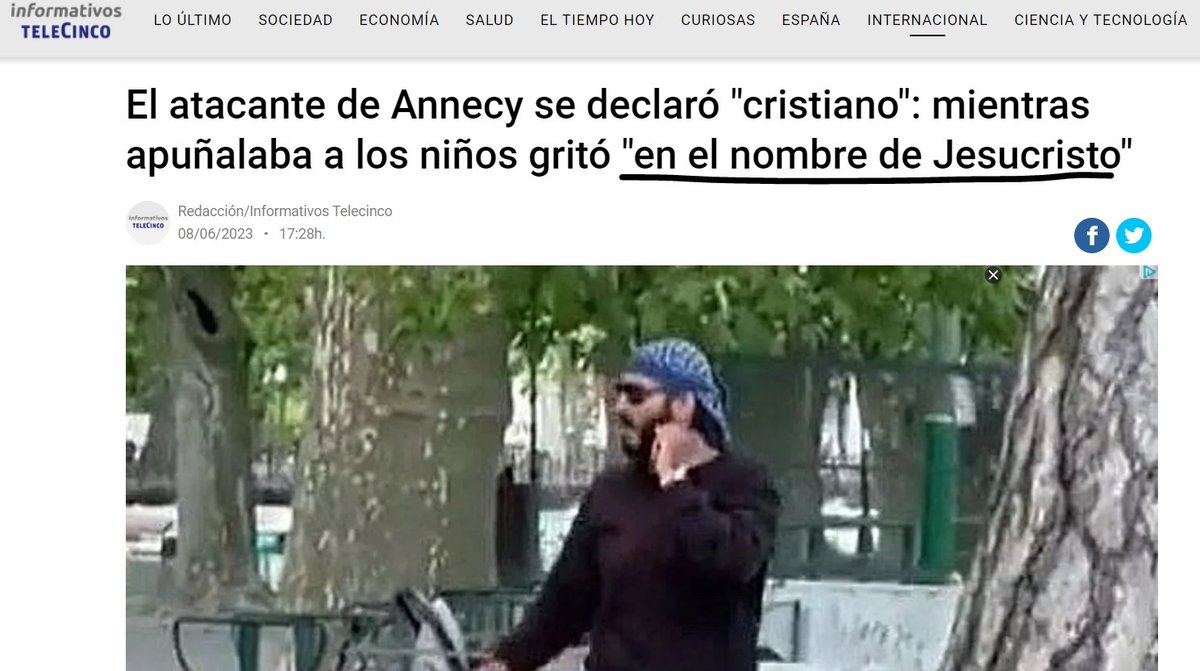 Y no porque no supieran que el criminal era cristiano, de hecho el medio francés que han usado como fuente BFMTV no solo publicaba el titular con la frase que gritaba el criminal "In the name of Hesus Christ", sino que publicaron el vídeo... pero ambas cosas las omitieron.