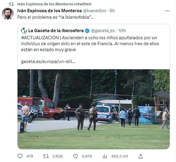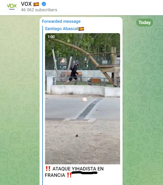 Los canales de telegram de VOX y Abascal hablaban de Ataque Yihadista, Iván Espinosa de los Monteros decía: "Pero el problema es la islamofobia..." en twitter.