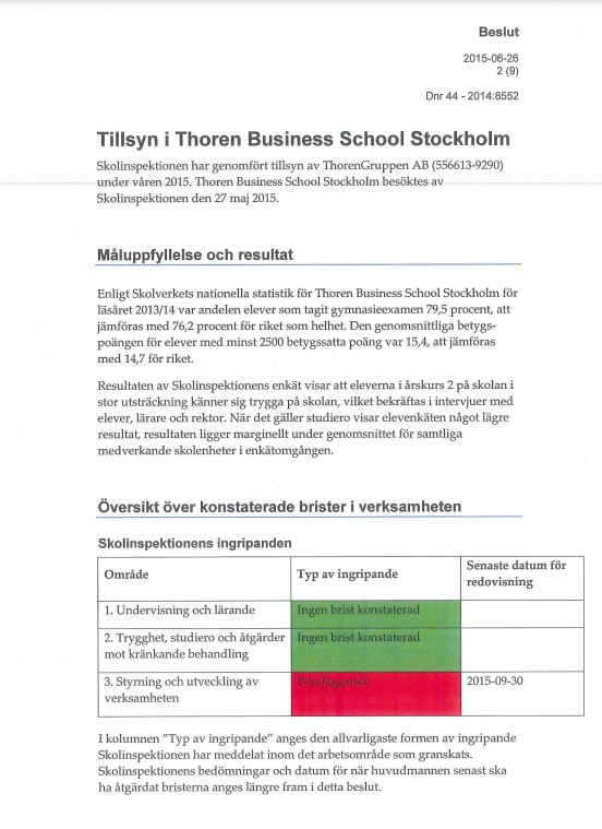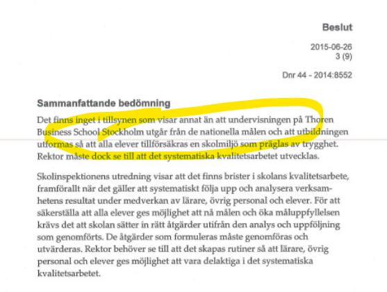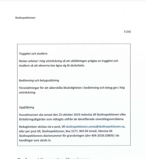 2015 gjorde Skolinspektionen en tillsyn och de hade inget avgörande att klaga på. Inget som enkelt fixades genom att få lite bättre ordning på pappren.
