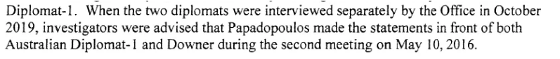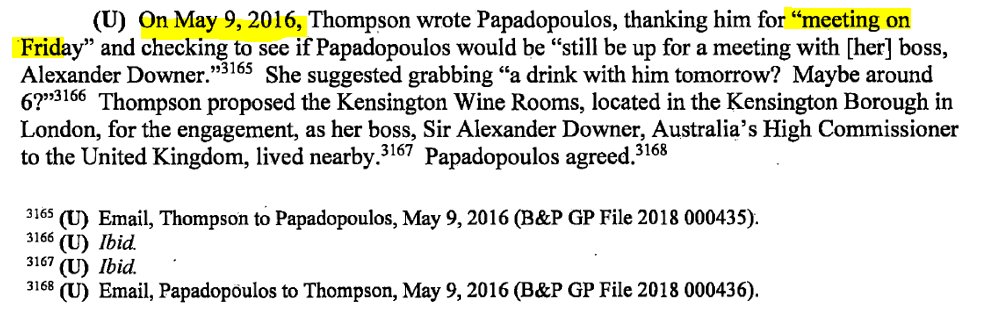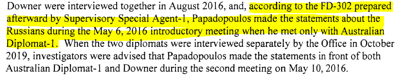 there's another large puzzle about Australians in Durham report, that Durham didn't comment on. In their Oct 2019 (separate) interviews, Downer and Thompson both stated that Papadopoulos' statements were made on May 10, 2016 at the wine bar when both were present.