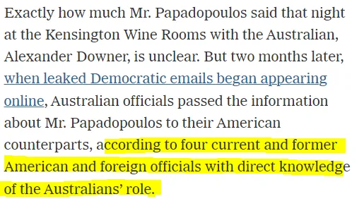 and yet Downer's evidence to Durham does the exact opposite: Downer directly questioned the Paragraph 5 reporting and denied that Papadopoulos had ever referred to a "Russian offer to assist".