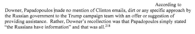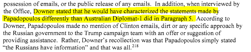 Durham reported on, but did NOT DISCUSS, Downer's amazing statement in Oct 2019 interview that Papadopoulos “made no mention of ... any specific approach by the Russian government to the Trump campaign team with an offer or suggestion of providing assistance”.