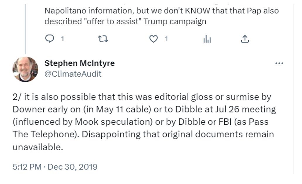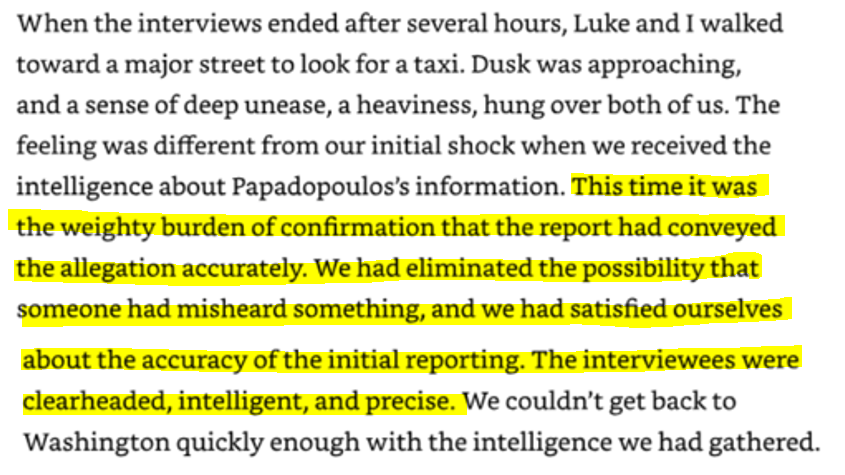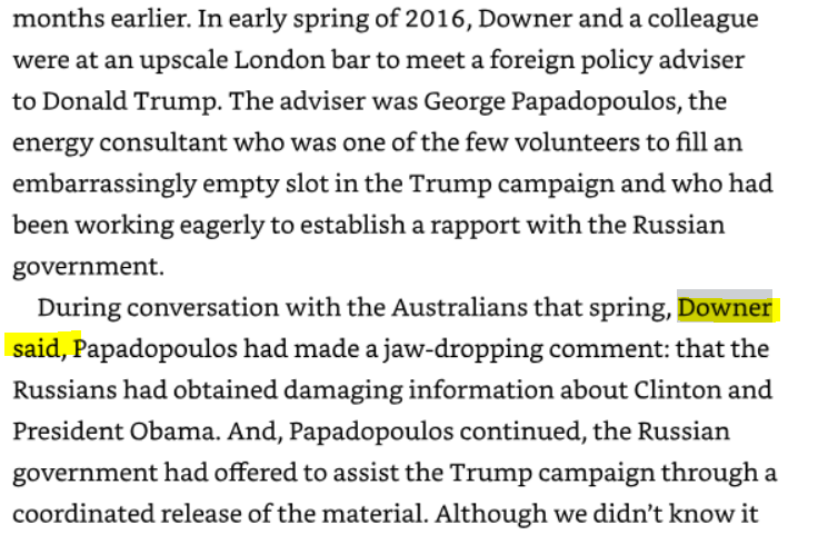 also, FWIW Mueller investigation did NOT interview either Downer or Thompson despite their importance to Crossfire opening. Why? My guess is that Weissmann et al realized that story was wonky and was more valuable to them uninvestigated than refuted.
