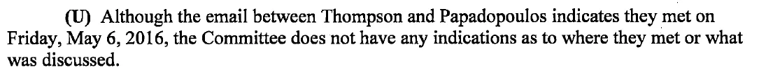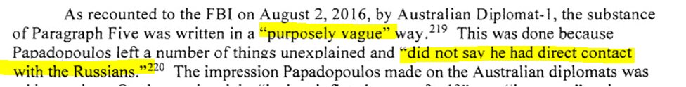 Durham reported that FBI 302 for Aug 2, 2016 stated that Thompson said that Paragraph 5 was "purposely vague" and that Papadop "did not say he had direct contact with the Russians".