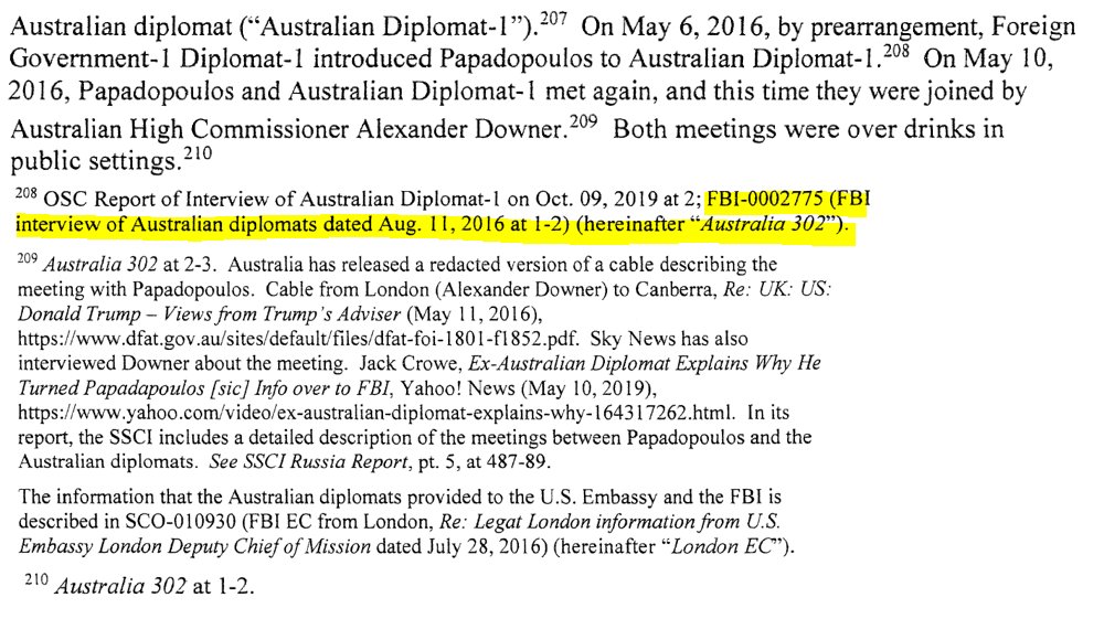 Durham Report is //FIRST// citation of FBI-302 for August 2, 2016 interview of Downer and Thompson (by Strzok and Pientka). Wasn't cited or mentioned by Mueller, SSCI or Horowitz. It was critical interview. Durham/@Weaponization need to release full 302.