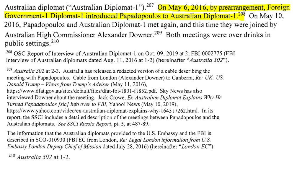 2/ Durham says that Israeli diplomat Christian Cantor introduced Papadopoulos to Erika Thompson on //May 6, 2016//, citing Oct 9, 2019 interview with Thompson and FBI-302 for Aug 2, 2016 meeting.
