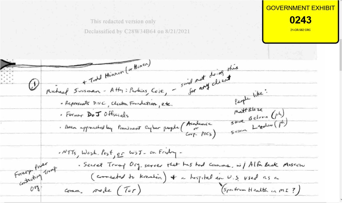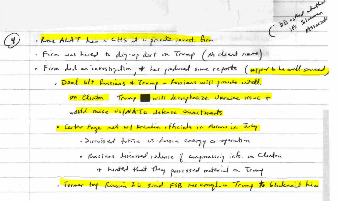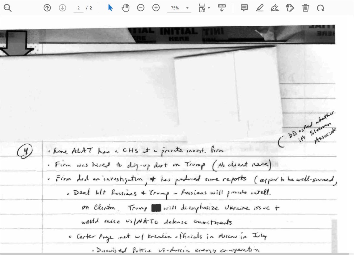 @Weaponization Exhibit 0243 (Sussmann) is incomplete and redacted version of [Priestap?] notes from ~Sep 19, 2016. It omits topics 2 and 3. FBI documents of its contemporary "intelligence" on hoax are rare and mostly withheld. Try to get all docs on this briefing. And others.