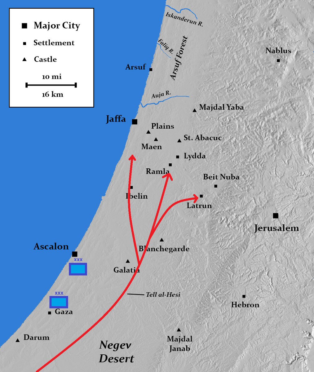 1177 was the only campaign he launched from Egypt. After crossing the frontier, he bypassed the Crusader forces assembled at Gaza and Ascalon and set his men loose across the land. Detachments pillaged as far north as Ramla.