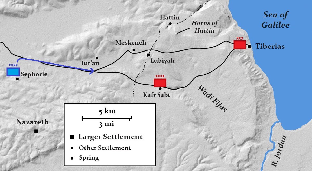 Saladin had left most of his army at Kafr Sabt while a smaller siege force invested Tiberias on 2 July. Before dawn on the 3rd, the Crusaders marched out from Sephorie.