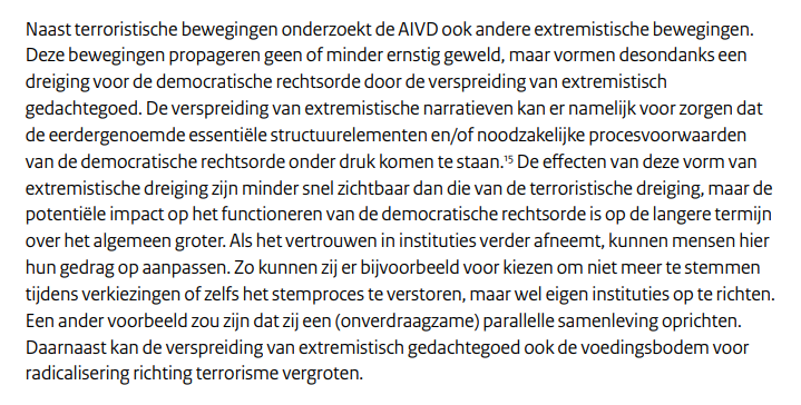 Bij de eerste zin had de AIVD de conclusie moeten trekken dat dit niet hun taak is. De dreiging die hier wordt benoemd is geen dreiging maar een functionerende democratie met pluriforme meningen. Of deze meningen waar zijn is niet aan de AIVD.