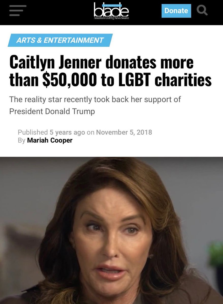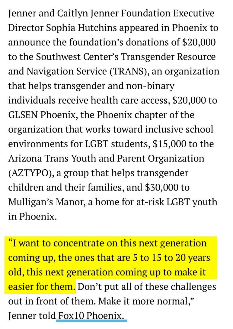 That same year, Jenner and partner Sophia Hutchins donated $20K to Southwest Center's Transgender Resource and Navigation Service, $15K to the Arizona Trans Youth and Parent Organization and $30K to Mulligan's Manor. All which support medically transitioning children. (5/9)