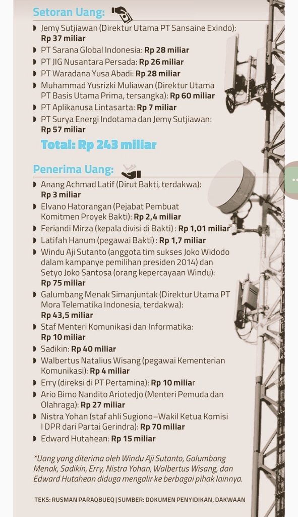 Nistra dikatakan mendapat jatah Rp 70 miliar. Dari Nistra-lah uang korupsi itu diduga mengalir ke sejumlah orang Senayan di Komisi itu, termasuk bosnya sendiri yakni Sugiono. Uang ini juga utk meredam perkara BTS agar tak lagi disinggung di rapat DPR.