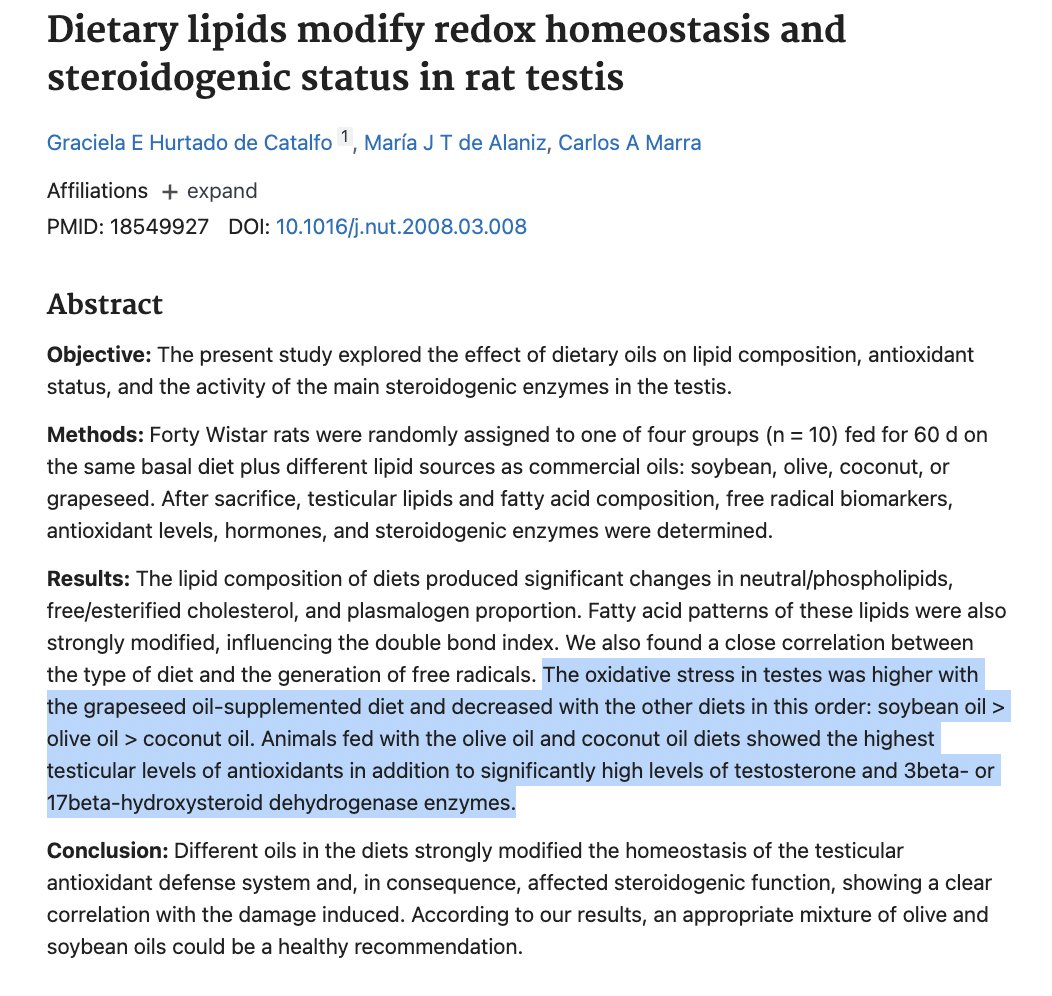 coconut oil has fatty acids that lead to the least amount of testicular oxidative stress and highest testosterone levels