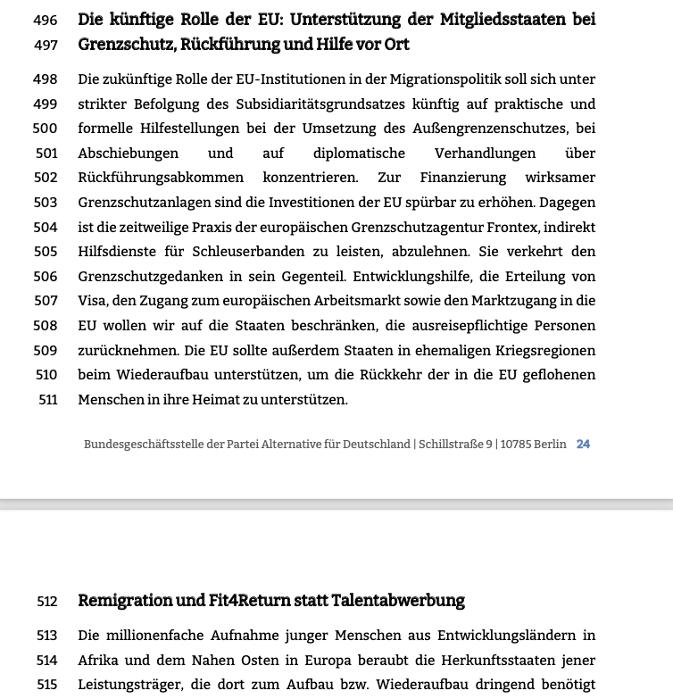 2. Die AfD will die „Festung Europa“: Die EU soll den physischen Außengrenzschutz massiv stärken, inkl. dem Einsatz des Militärs der Mitgliedsstaaten. „Remigration“ soll über ein EU-Programm namens „Fit4Return“ forciert werden.