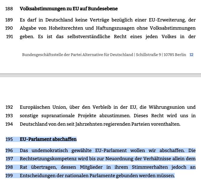 Die #AfD hat den Entwurf ihres Europawahlprogramms finalisiert. Gleich zu Beginn fordert sie die Auflösung der EU. Sachlogisch wäre das also schon das Ende des Programms, weil eine aufgelöste EU keine Politik mehr macht. Dennoch folgt ein Katalog europapolitischer Forderungen:🧵