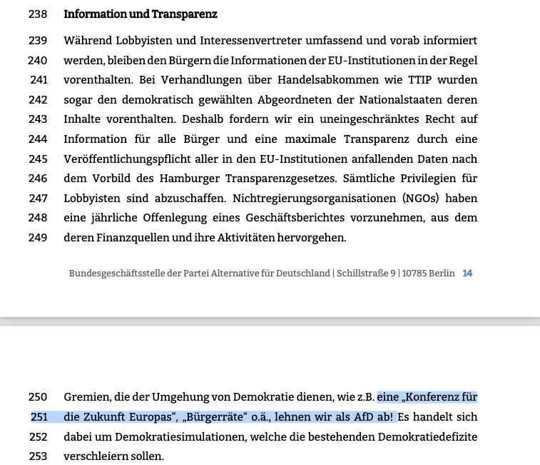 4. Das EU-Parlament will die AfD auflösen. Sie kandidiert also für ein Parlament, das sie abschaffen will. Sie stellt sich auch gegen Formate der Bürgerbeteiligung in der EU: Bürgerräte und Zukunftskonferenzen lehnt sie ab.