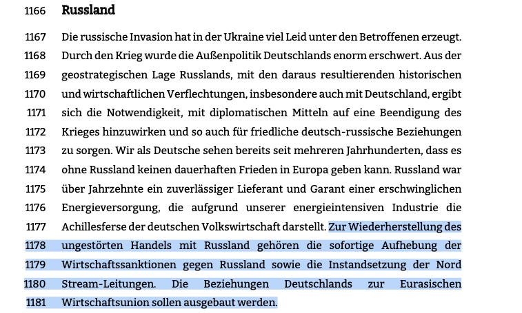 7. Die Russland-Sanktionen der EU will die AfD aufheben und Putins Gas über Nord Stream wieder nach Europa strömen lassen.