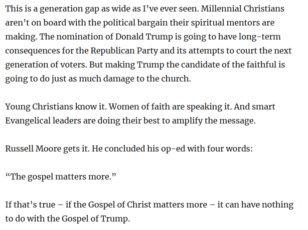 You could see the damaging witness of politics over Christ coming in 2016. Here's what I wrote then, again featuring Russell Moore as a prominent contrarian voice: dylanmclemore.com/2016/10/13/don…