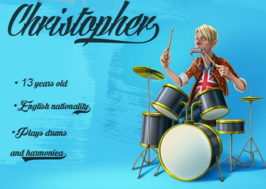 ۹.. کریستوفر: ۱۳ ساله برادر کریستین ،نوازنده ساز دهنی و عاشق درام و آلات موسیقی.خیلی نقطه نمیشد.