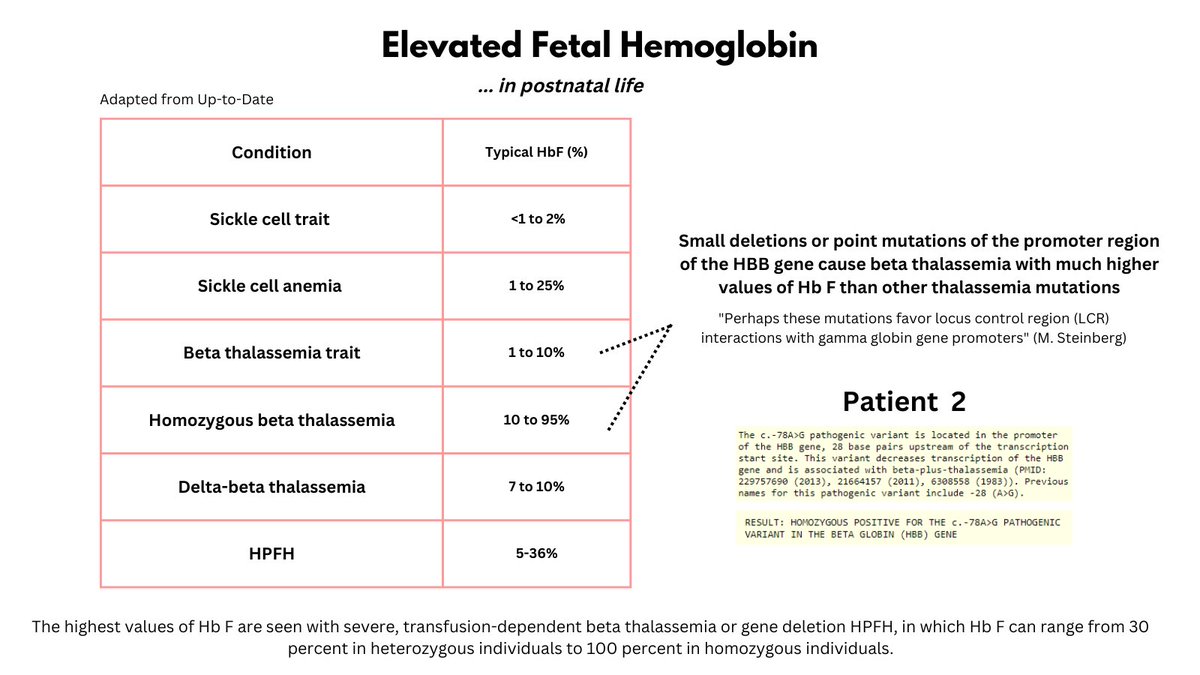 Different conditions lead to varying degrees of HbF elevation (see graphic). To determine the mechanism underlying this patient's remarkably high HbF, we carried out DNA sequencing. The patient was found to have a homozygous mutation in the promoter site of the beta gene.
