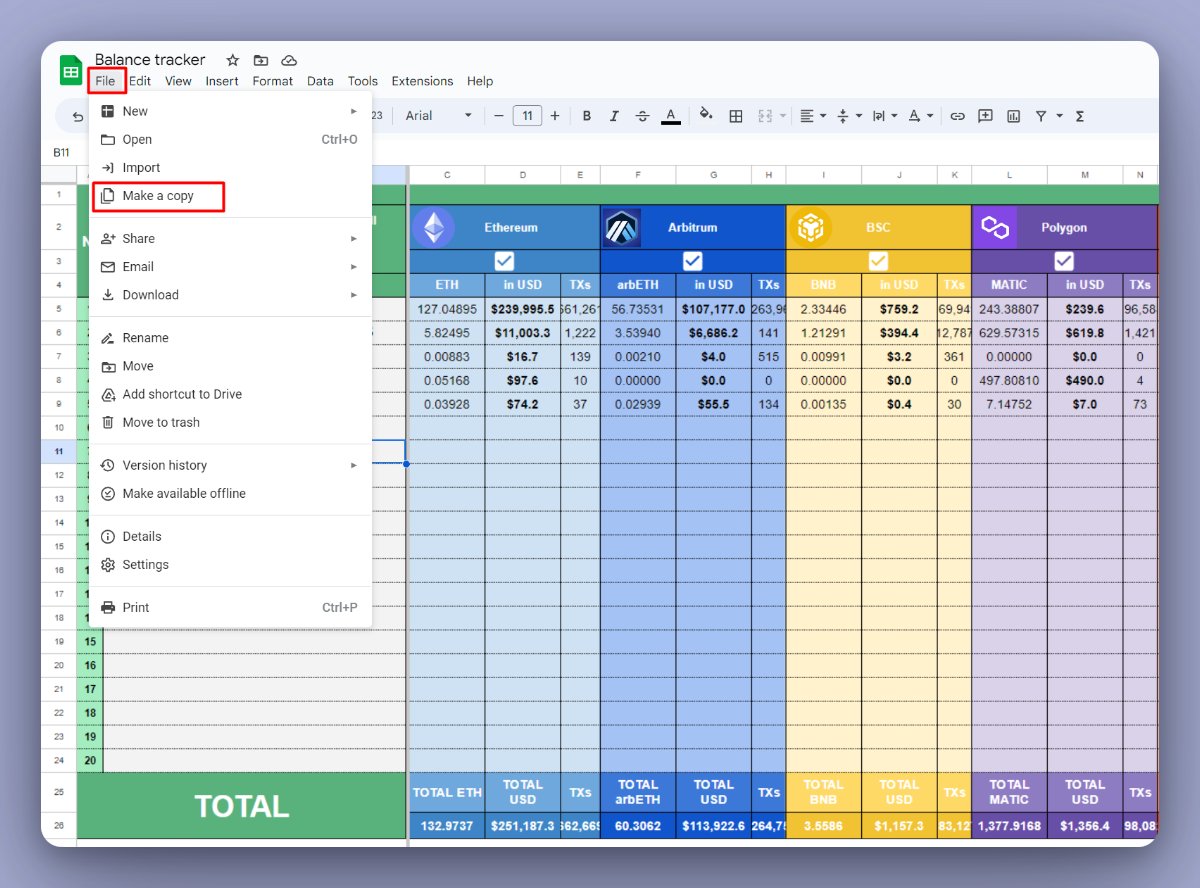 This spreadsheet runs on scripts, takes information from blockchain scans. It has the ability to hide balances in individual networks to save parsing resources.