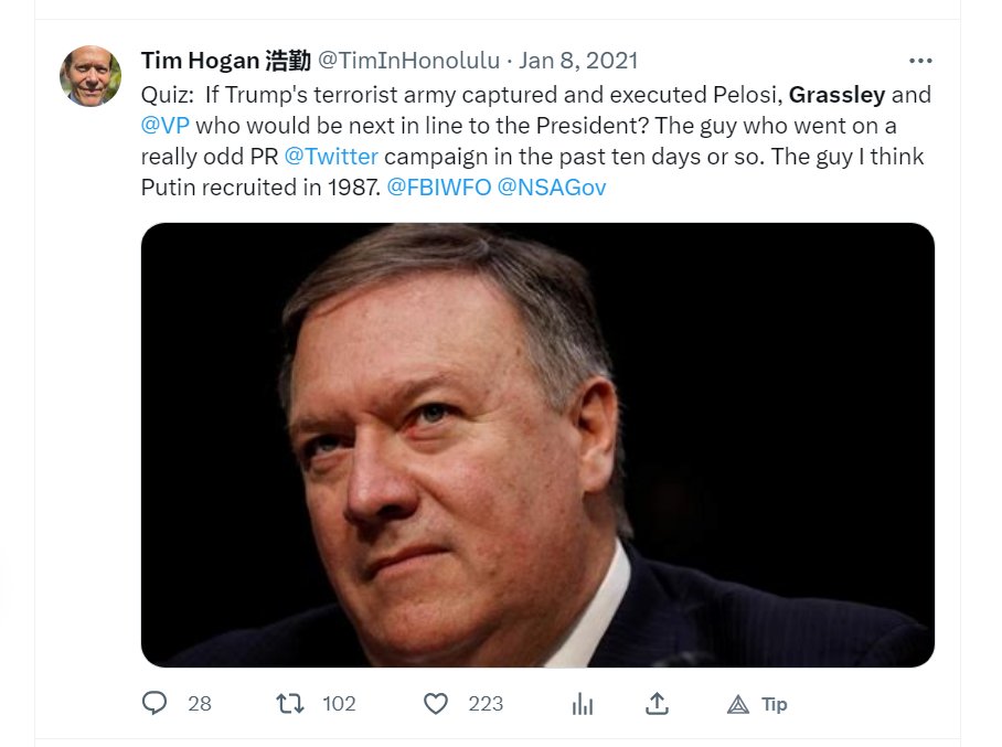 11. Grassley would either decline the presidency or be assassinated and the new POTUS 46 would be this guy. A loyal soldier IMO of Putin and his business partner Charles Koch. Did they call Pompeo to the grand jury? I don't think so and that's because he's going to be charged.