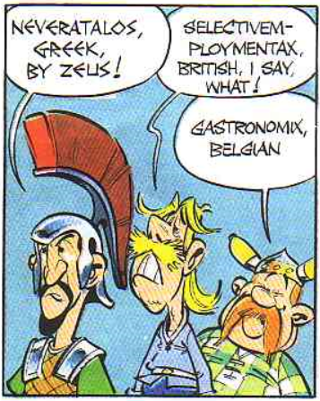 Así, cada frase que pronuncia un bretón, aunque no tenga importancia, es graciosa («Le Figaro», suplemento «Astérix l’Irreductible» 2005). Aunque este recurso ya se había usado en la literatura francesa («L’anglais tel qu’on le parle» comedia teatral de Tristan Bernard, 1899)