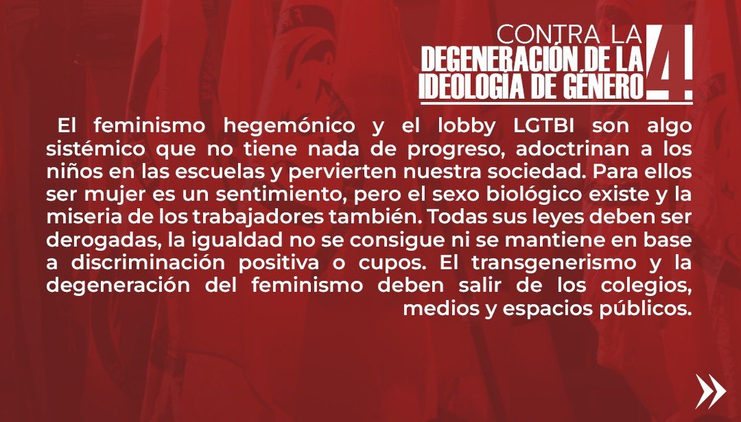 4️⃣ Contra los derechos de mujeres y personas LGTBI+, que traen "degeneración", "adoctrinan a los niños en las escuelas" y "pervierten la sociedad". Defensa de la familia burguesa tradicional y heterosexual.