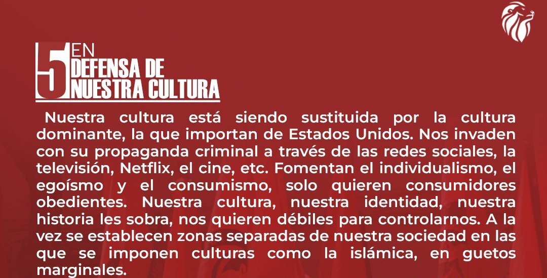 2️⃣ La inmigración y el mestizaje (étnico y cultural) llevaría a la desaparición de la cultura patria y de la soberanía nacional, en nombre de unos ocultos "intereses extranjeros".