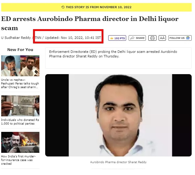 ♦️பொய் 3 : AUROBINDO நிர்வாக இயக்குநர் கைது செய்ய பட்ட நாள் : ஏப்ரல் 11, 2022