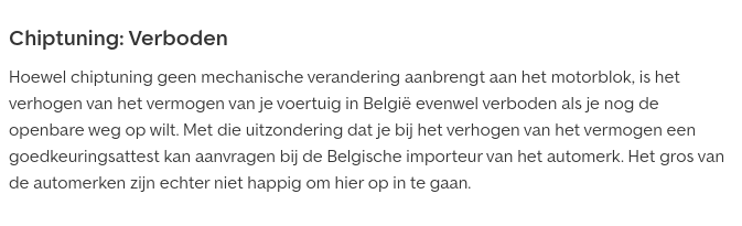 Dan nog een laatst voetnoot: In belgie is ChipTunen verboden. Het Chiptunen maakt het knallen en borrelen van de motor mogelijk. onder het mom 'beter rendement' is chiptunen de grootste veroorzaker van de overlast, na uitlaatkleppen en custom uitlaten.