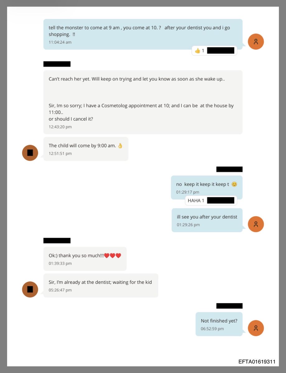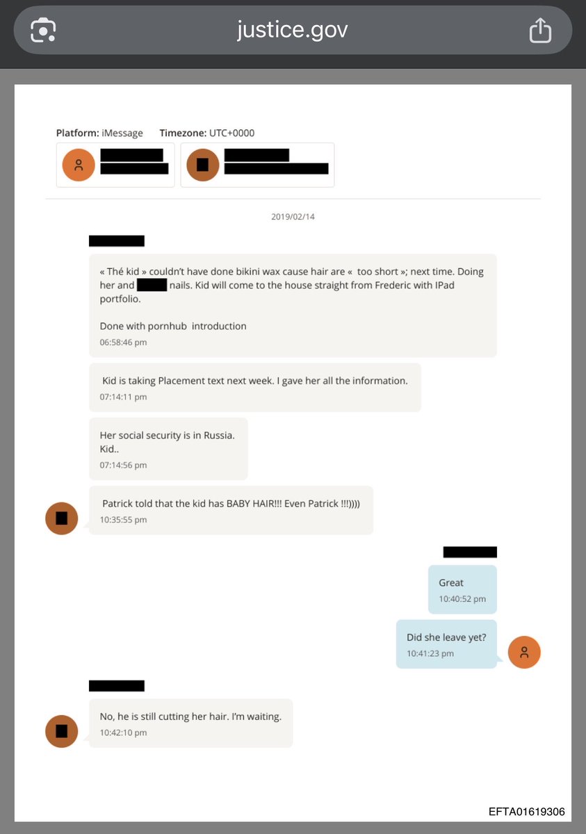Fine, I was hoping to sit on this for later, but here’s a corroborating convo of redacted individuals, one of whom appears to be an Epstein employee, talking about not being able to give a bikini wax to “the kid” from Russia bc of her short pubic hair, a barber remarking at baby hair, the procurer accompanying the girl repeatedly pointedly telling the barber “she’s 21…”, and then the pair seemingly scheduling her for a massage appointment at the townhouse or where have you.