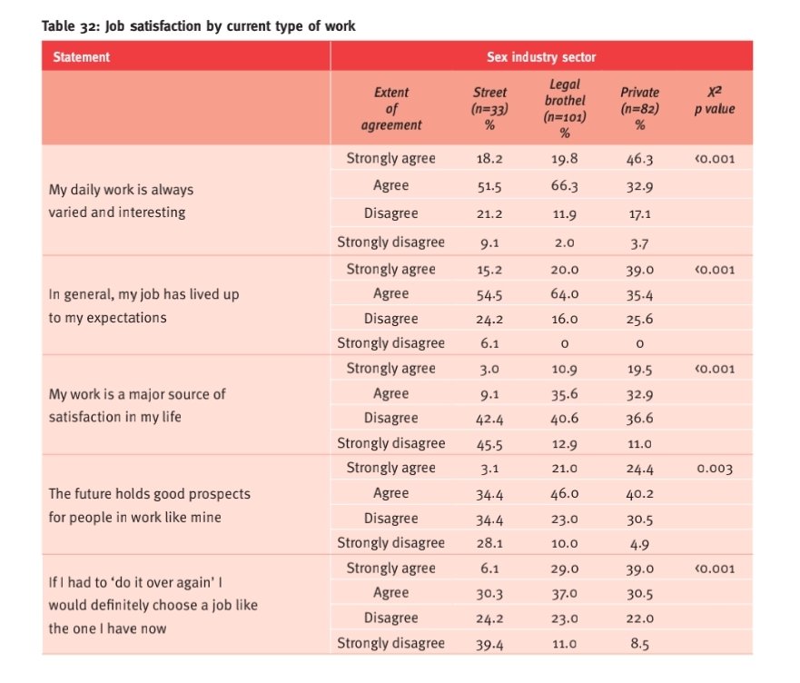 En la tabla 32 del estudio, encontramos que quienes puntúan más alto en la mayoría de elementos de satisfacción suelen ser, curiosamente, quienes trabajan en burdeles legalmente autorizados, si bien en muchos casos el trabajo no es su principal satisfacción.