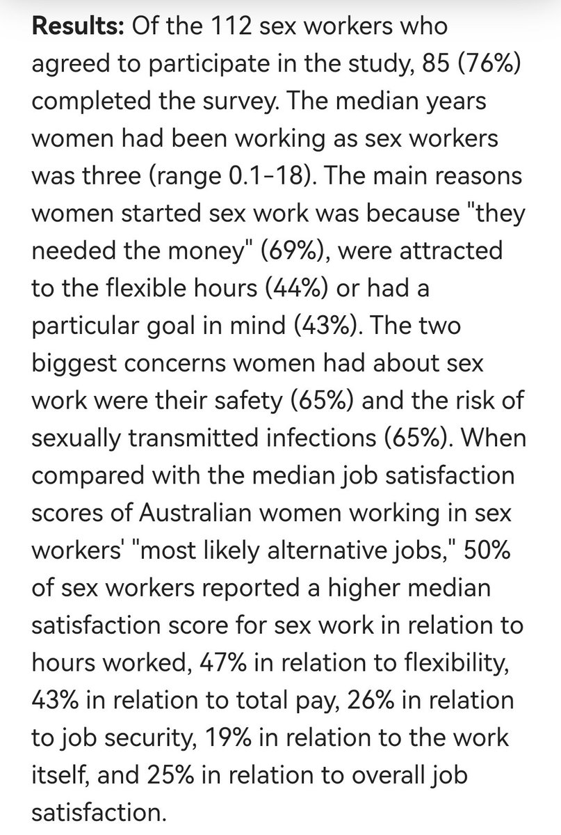 Para este estudio, se compararon los niveles de satisfacción laboral de las prostitutas australianas del área de Victoria con el de las mujeres australianas comunes, mediante un cuestionario sobre trabajo sexual y el trabajo alternativo más deseado para quienes ejercen el TS.