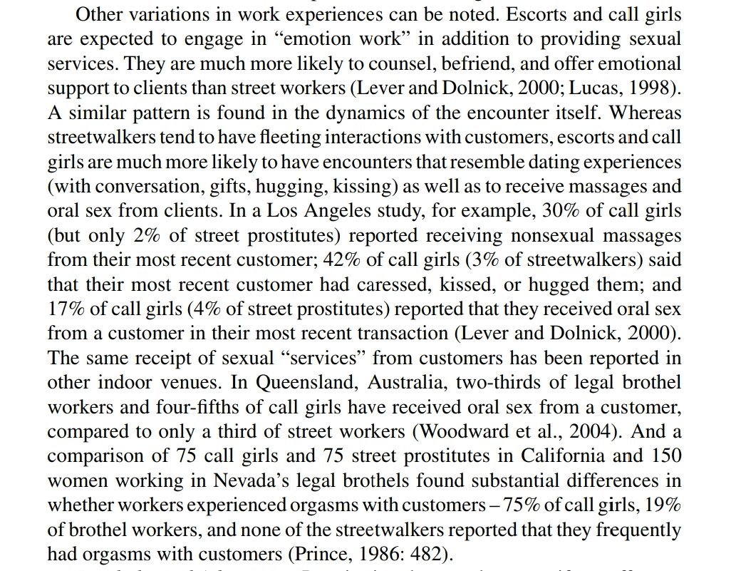 Weitzer analiza incluso las diferencias entre el trabajo sexual a pie de calle y el trabajo sexual de las escorts y otras TS de alto nivel.