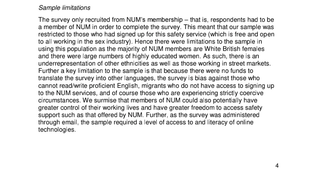 Importante también tener en cuenta que el único tipo de trabajadora sexual que se analiza en el estudio es aquella que trabaja en interiores (pisos, burdeles, etc.), siendo que sería necesaria información de otros tipos de prostitutas.