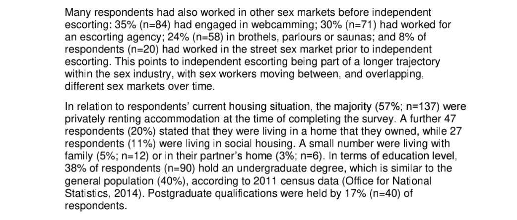Sin embargo, muchas de las mujeres que respondieron a la encuesta habían participado previamente en otras formas de trabajo sexual (incluyendo el callejero) hasta llegar a ser escorts independientes, reportando mayores grados de independencia en la mayoría de los casos.