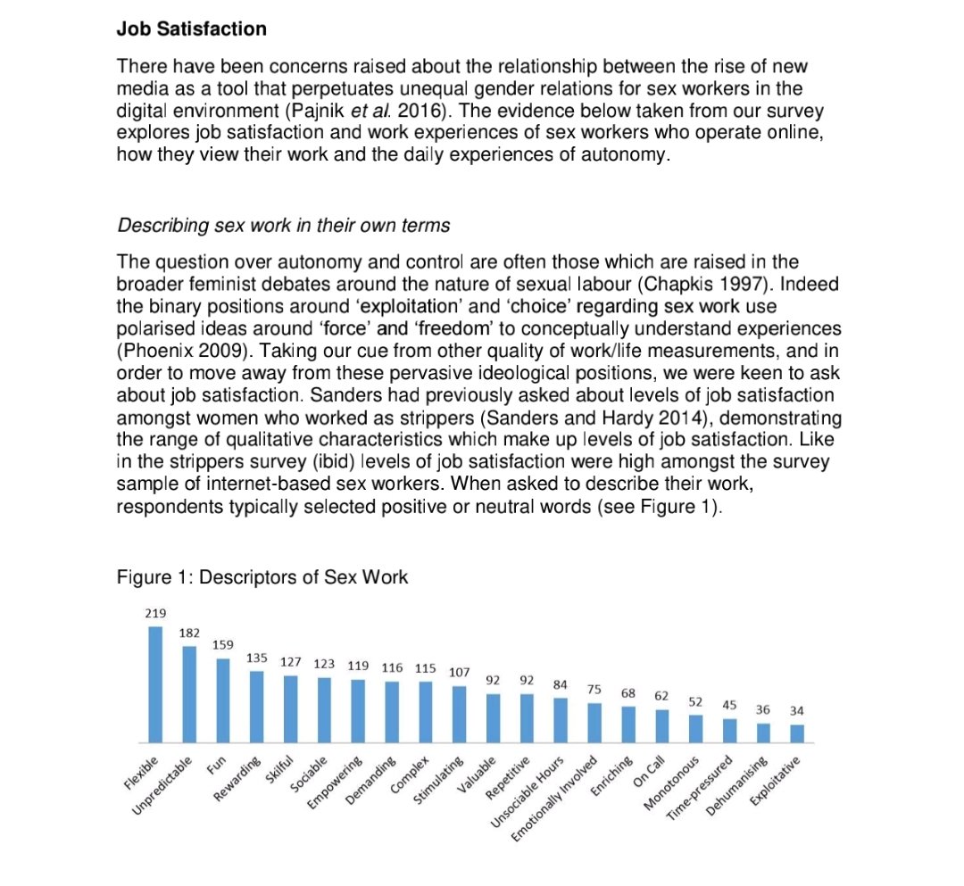En este estudio británico, que analiza las condiciones laborales de quienes ejercen el trabajo sexual por vía online empleando una muestra con un n de 240 participantes, se exponen, aunque con una muestra poco representativa, los niveles de satisfacción de diversos TS online.