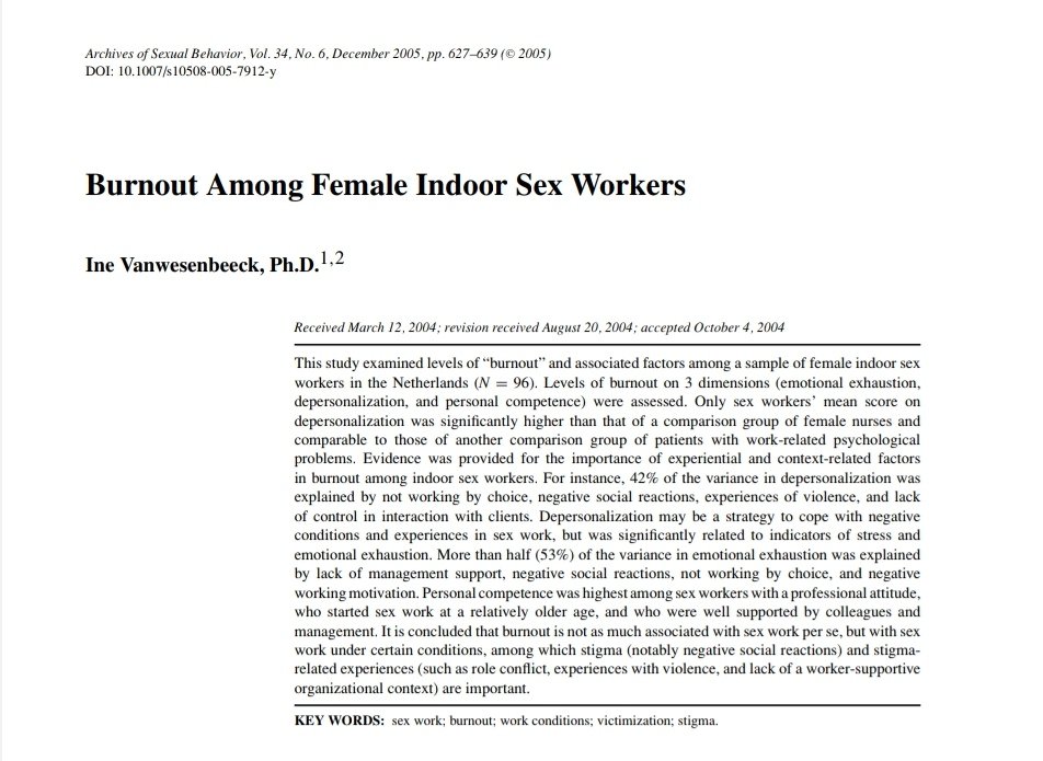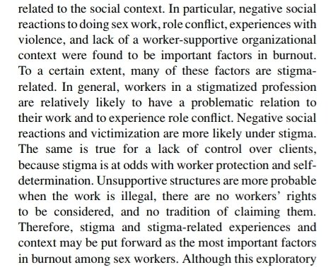 Asimismo, el estudio señala que en el caso del trabajo sexual el origen de este "burnout" muchas veces proviene del propio estigma social, así como de la falta de protección laboral, y no necesariamente del propio ejercicio del trabajo sexual, con lo cual las condiciones importan